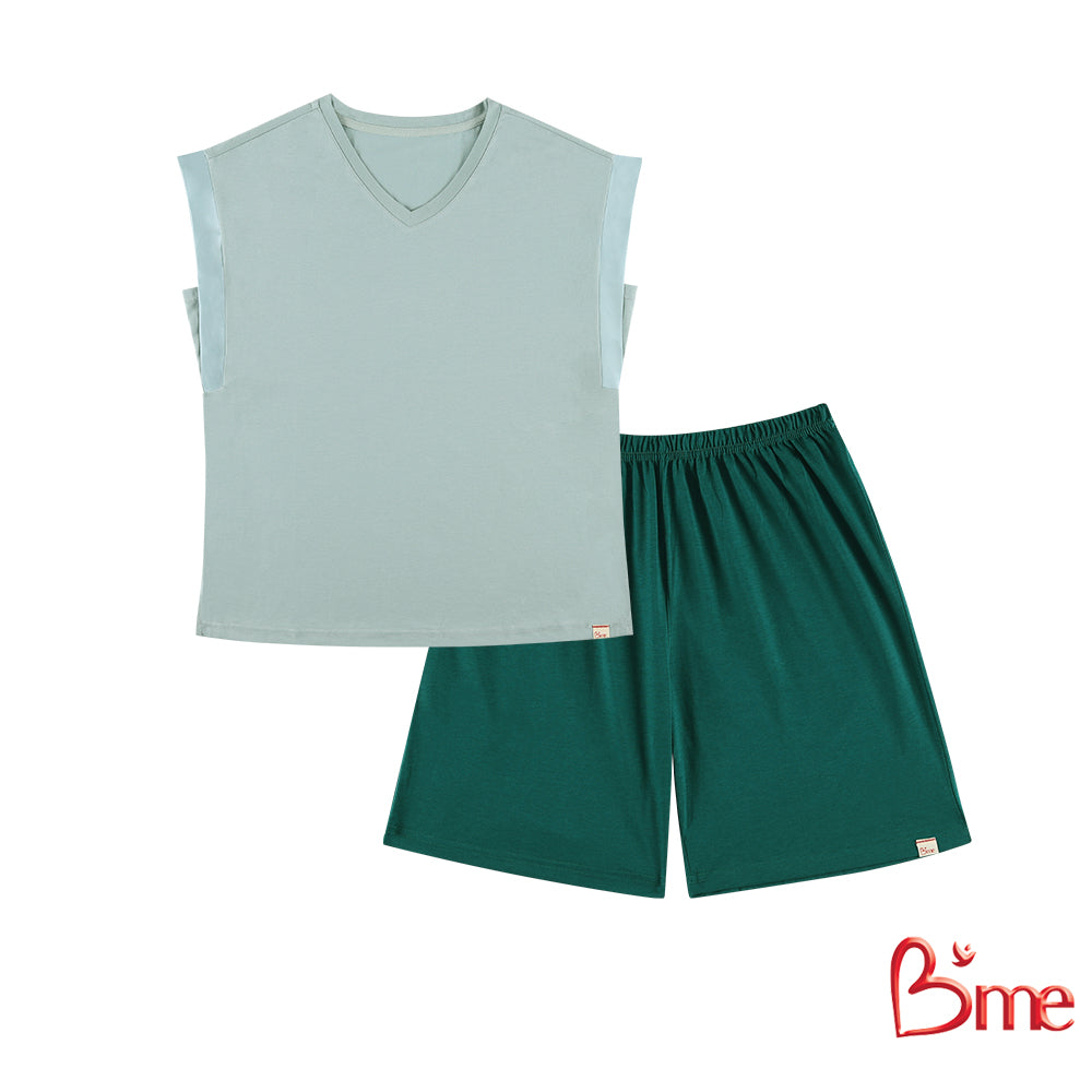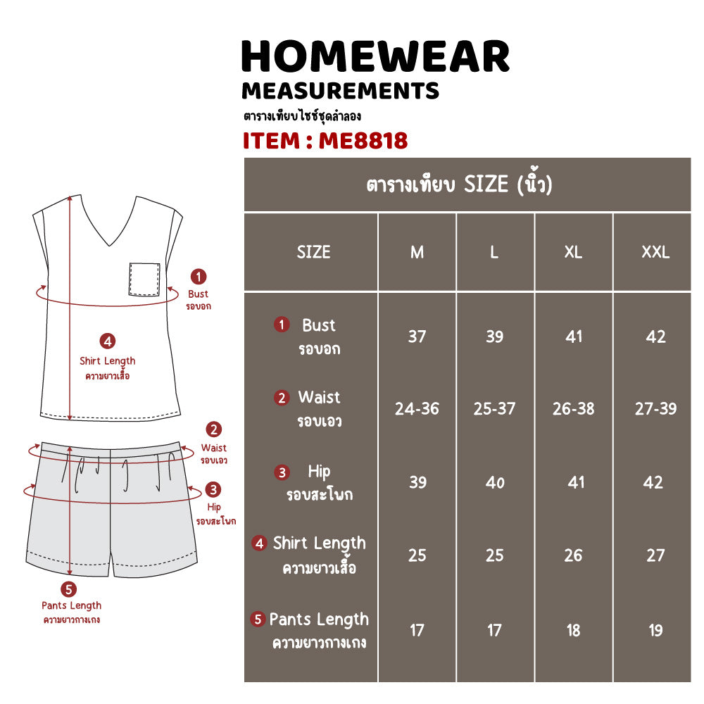 จุดเด่นสินค้า:ชุดนอนรูปแบบเสื้อแขนล้ำคอวี พร้อมกางเกงสั้น
