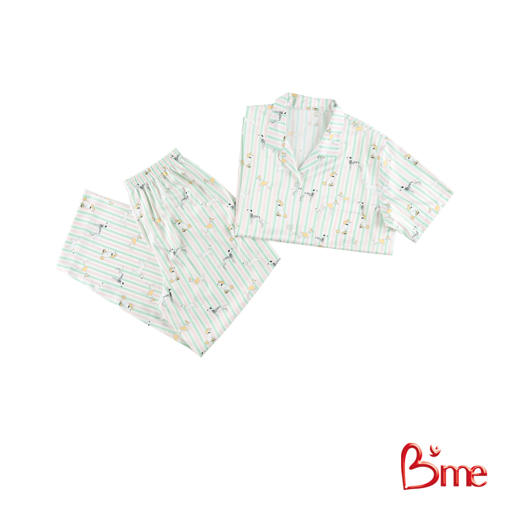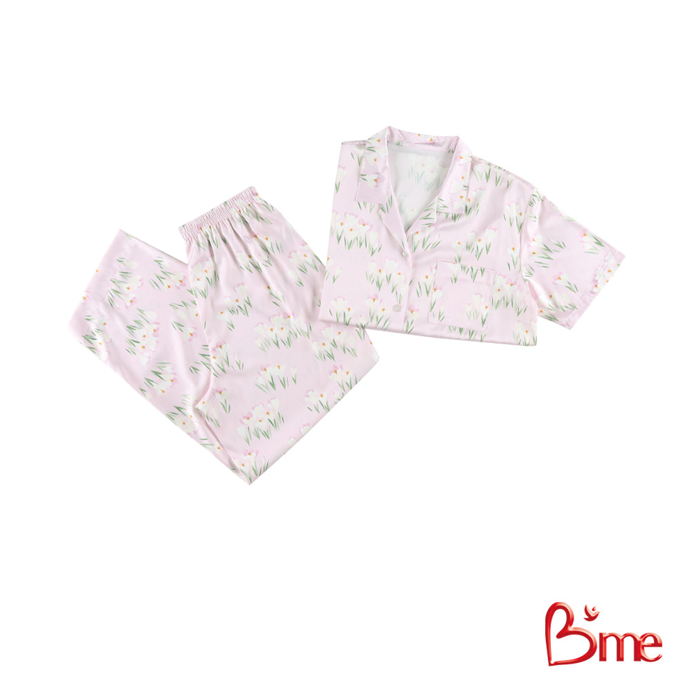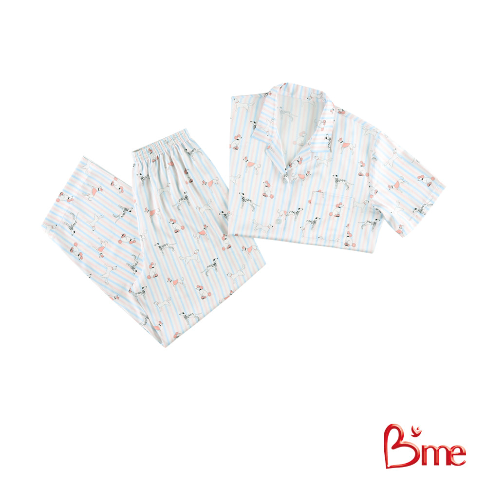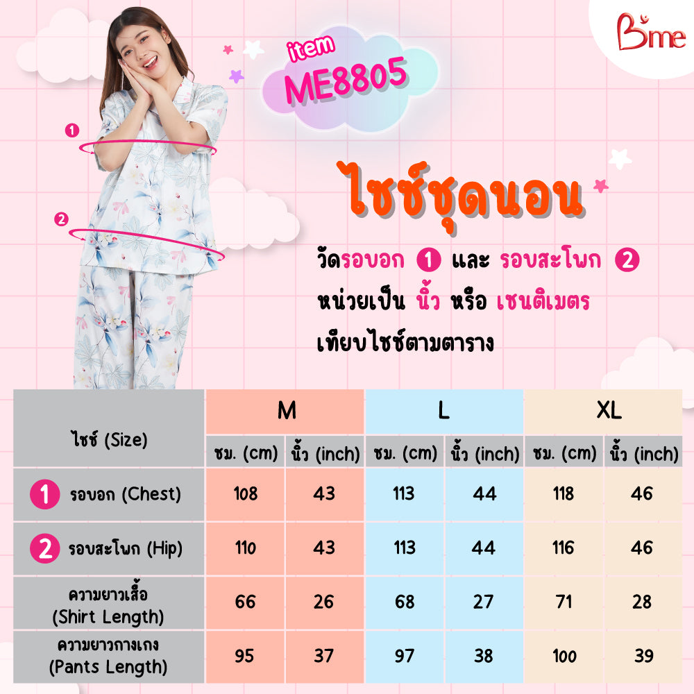 B'me ชุดนอนเสื้อแขนสั้นพร้อมกางเกงขายาว คอฮาวาย รุ่น ME8805 มี 4 สี สีฟ้าลายดอกไม้ สีม่วงลายดอกไม้ สีเขียวลายน้องหมา สีฟ้าลายน้องหมา M.10.25