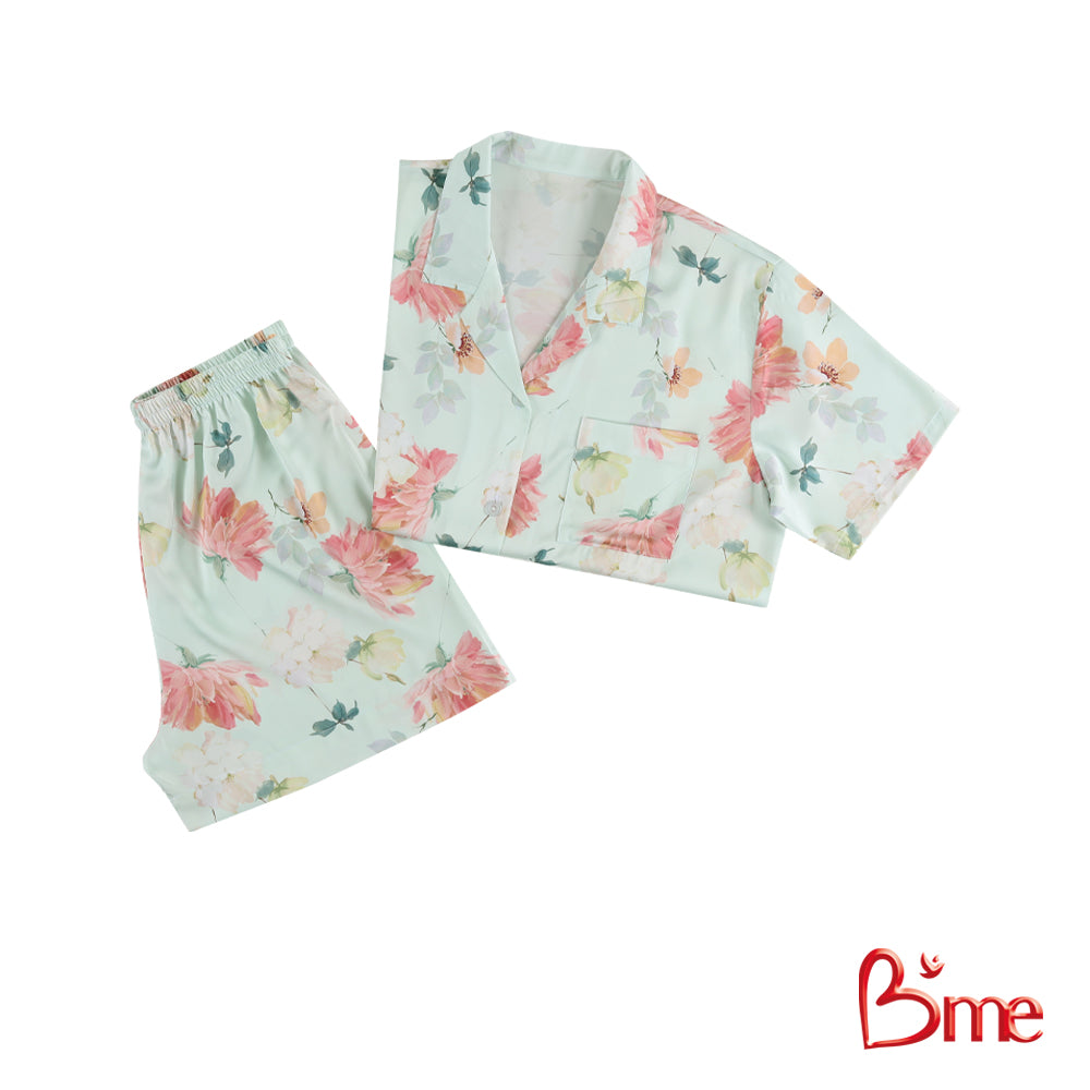 B'me ชุดนอนเสื้อแขนสั้นพร้อมกางเกงขาสั้น คอฮาวาย รุ่น ME8804 มี 4 สี สีฟ้าลายดอกไม้ สีม่วงลายดอกไม้ สีเขียวลายน้องหมา สีฟ้าลายน้องหมา M.10.25