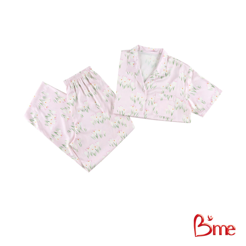 B'me ชุดนอนเสื้อแขนสั้นพร้อมกางเกงขายาว คอฮาวาย รุ่น ME8805 มี 4 สี สีฟ้าลายดอกไม้ สีม่วงลายดอกไม้ สีเขียวลายน้องหมา สีฟ้าลายน้องหมา M.10.25